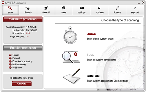 • intuitiv verständliches Interface. Switz Antivirus wurde als Antivirus-Lösung für einen breiten Kreis der Benutzer entwickelt, die unterschiedliche Computerkenntnisse haben.